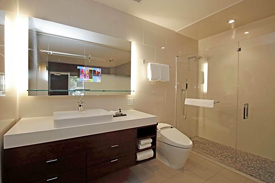 This room features a 52-inch flat-screen TV. There is a mirror TV in the private bathroom.